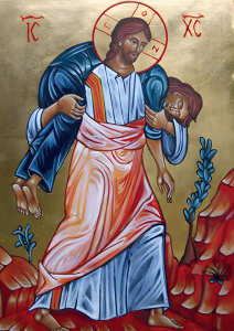 L’icône pèlerine représente Jésus Bon Samaritain en marche qui porte sur ses épaules chacun d’entre nous.